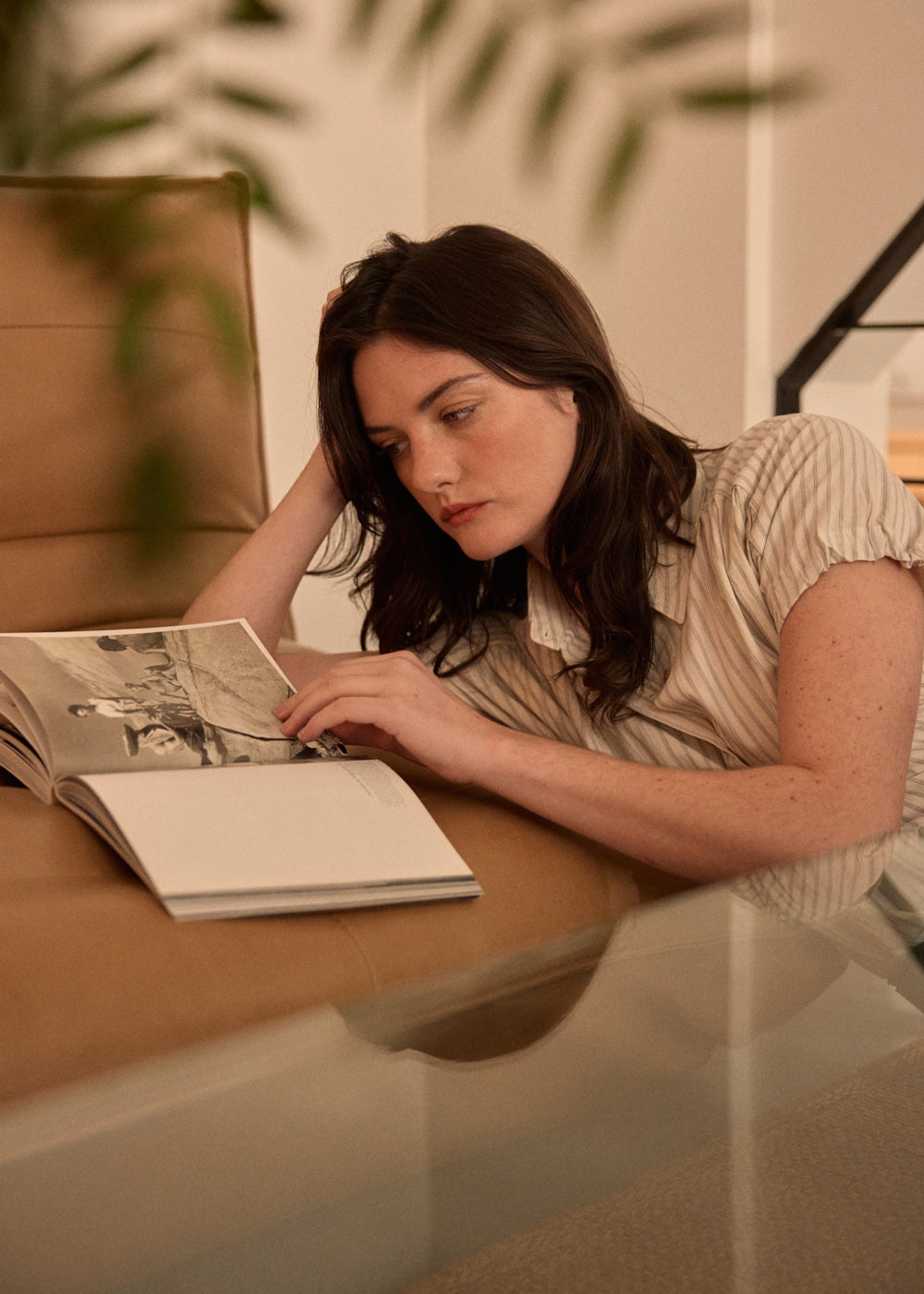 - À la fin de l’été, portez la chemise KARLA avec un pantalon fluide et des sandales plates pour une allure fraîche et lumineuse.
