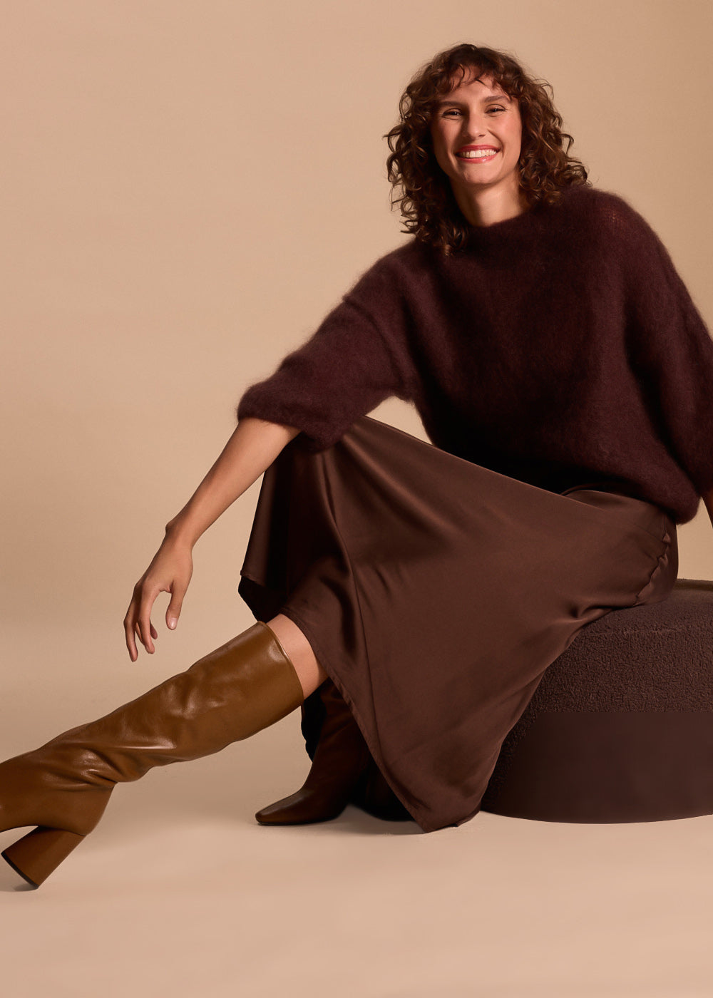 - En plein hiver, portez-la avec un pull oversize, une ceinture en cuir et des bottines pour une silhouette douce et citadine.