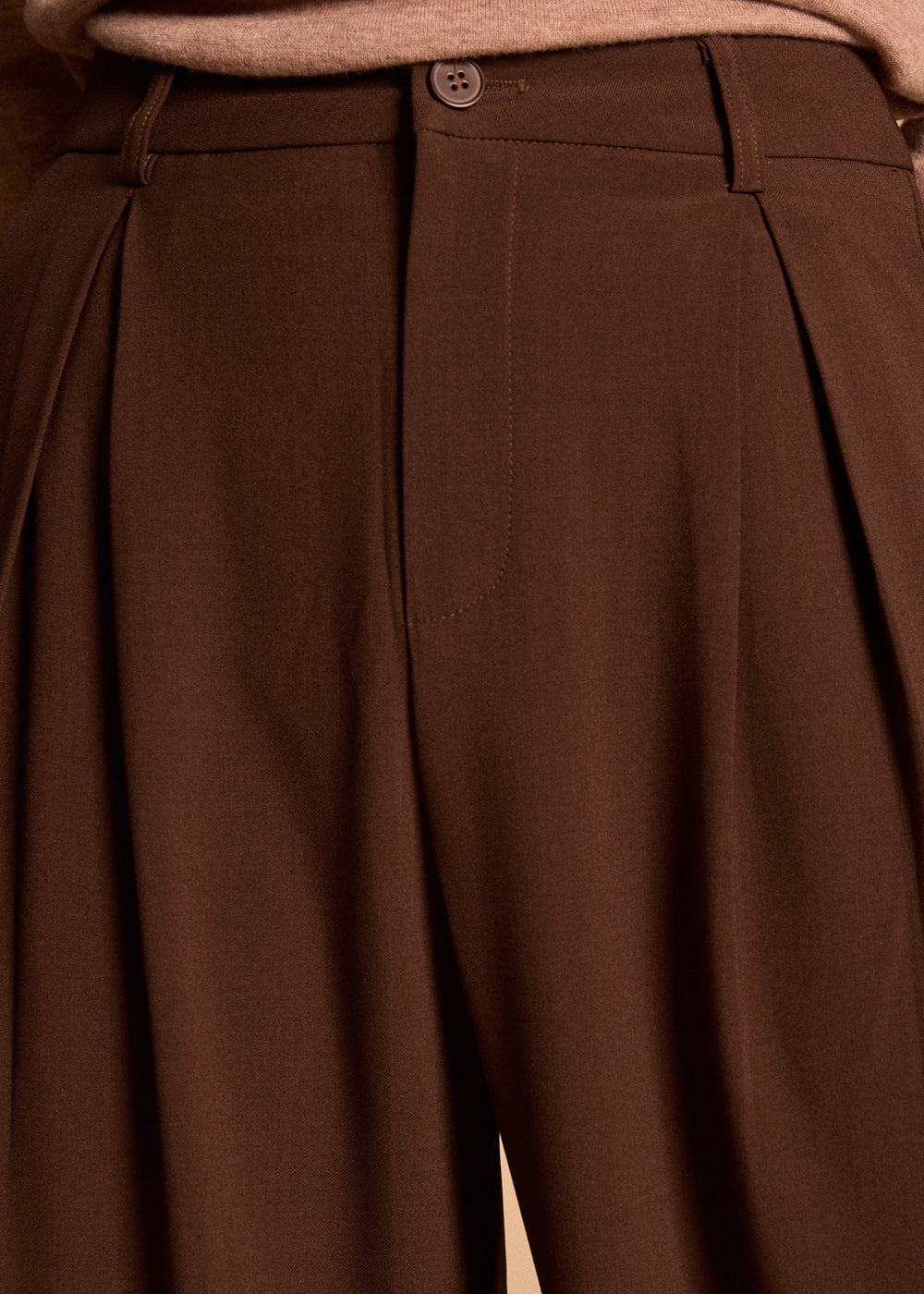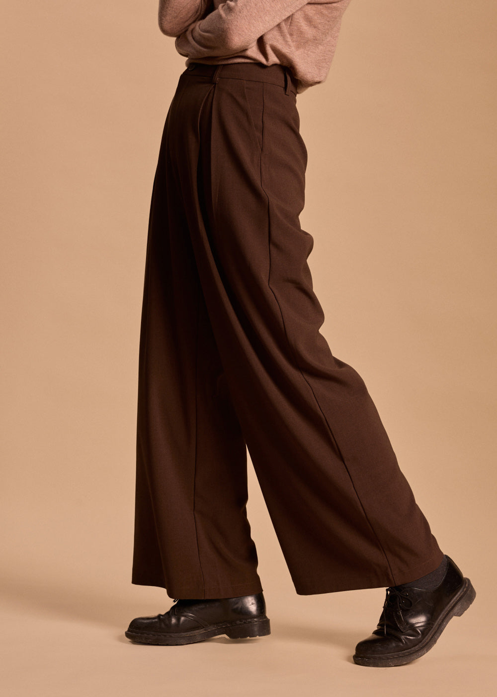 avec sa coupe ample et son tombé impeccable, offre une silhouette architecturée sans jamais sacrifier la fluidité. Son coloris Choco, riche et profond, ancre votre tenue dans des tonalités chaudes et sophistiquées, idéales pour la saison. Les pinces délicatement travaillées à la taille confèrent une tenue parfaite et une touche tailoring qui féminise instantanément l'ensemble. Adopter le Pantalon MAHE, c'est choisir un chic décontracté, une pièce forte qui s'adapte à toutes les occasions, du bureau à vos escapades du week-end.