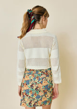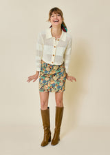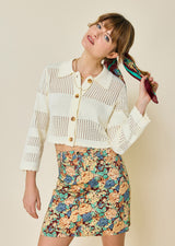 Gabriella wears the GINETTE collared cardigan with the DALINE skirt.