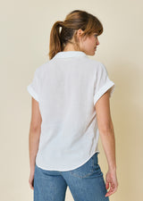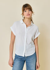 Yanne wears the HELENE casual shirt with the DOLINE skirt.