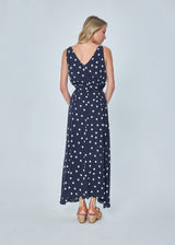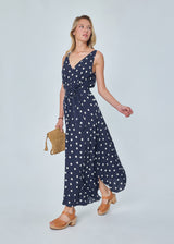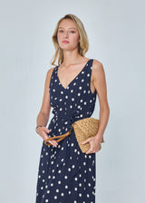 Alisa porte la robe longue à bretelles ANNE, son sac à main et sa paire de sandales.