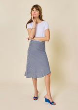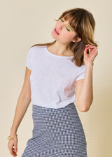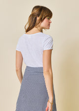 Gabriella wears the LILI cotton t-shirt with the SAKURA skirt.
