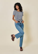 Yanne wears the WHITNEY short-sleeved knotted tee with JAIME jeans and a pair of heeled mules.