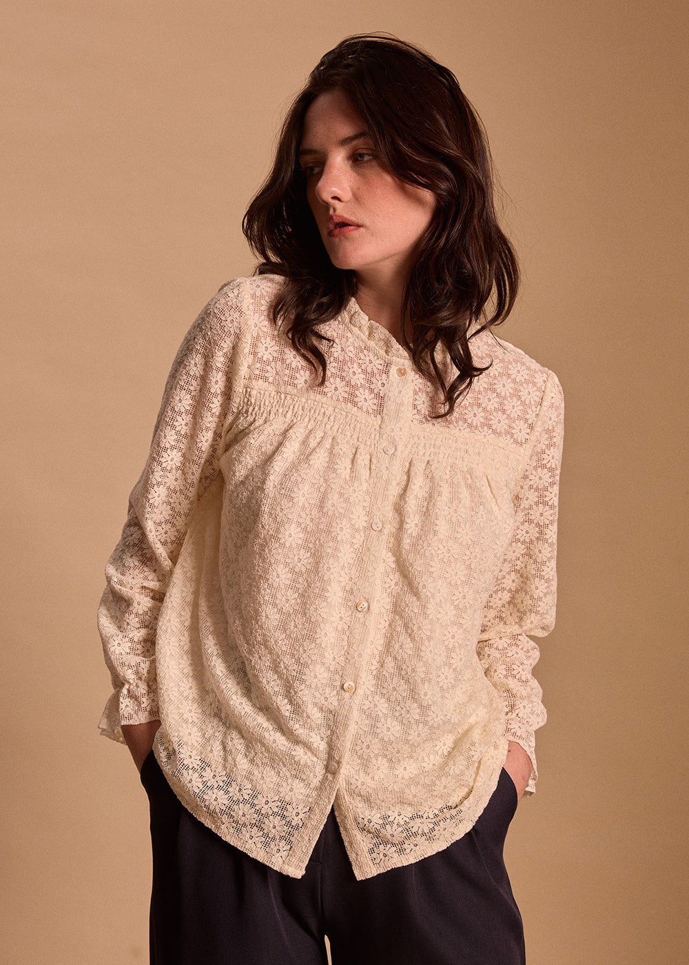 - À la fin de l’été, portez le chemisier AELIS avec un short en lin et des sandales pour une allure bohème et aérienne.