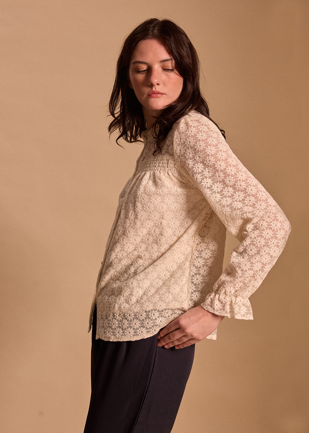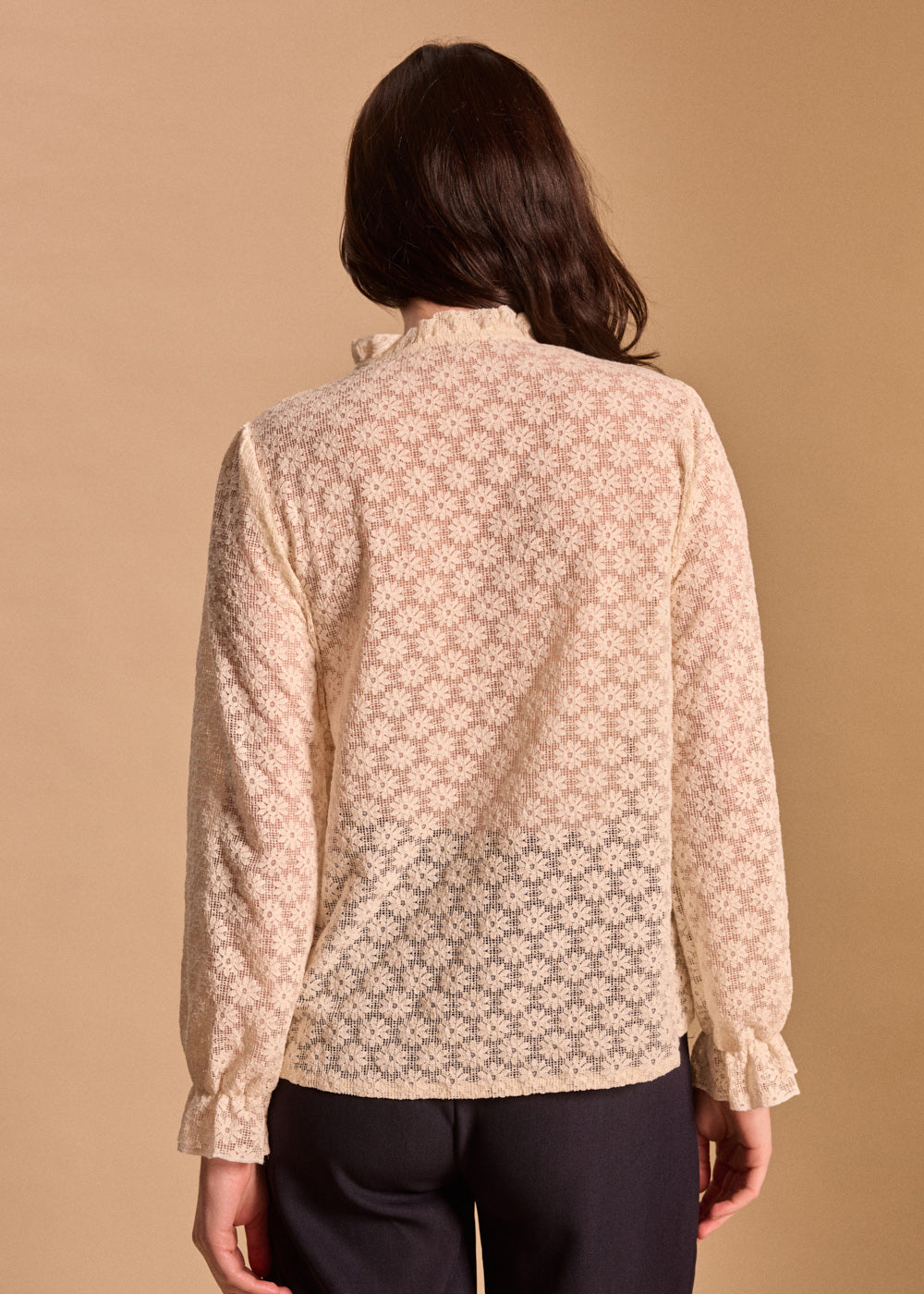 - Manches longues légèrement froncées aux poignets