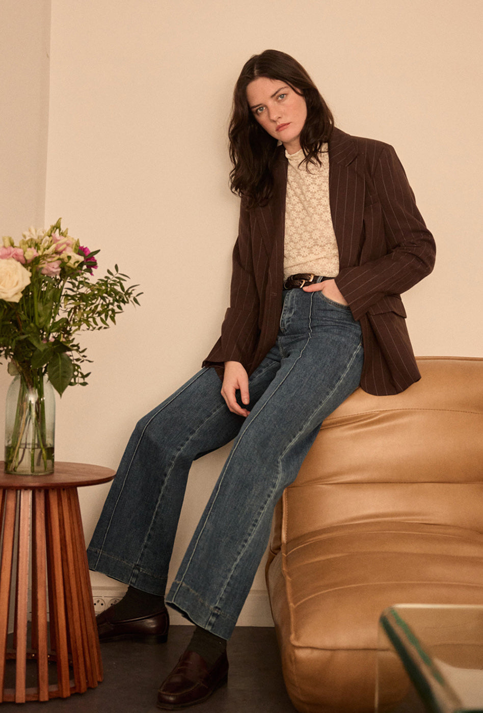 - À l’entrée de l’automne, glissez-le dans un jean taille haute et ajoutez un cardigan en maille douce pour un look citadin et raffiné.